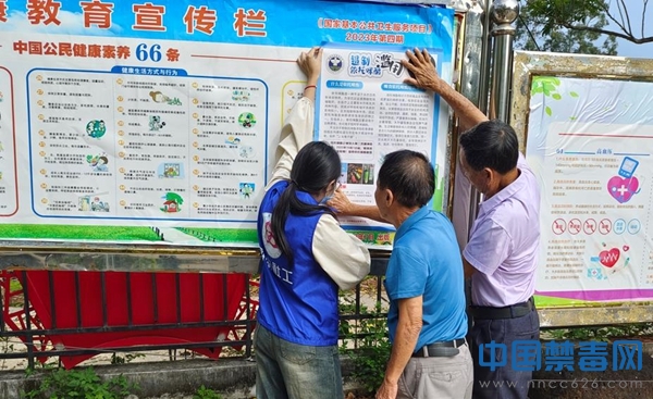 图为工作人员张贴禁毒宣传海报。中国禁毒网发