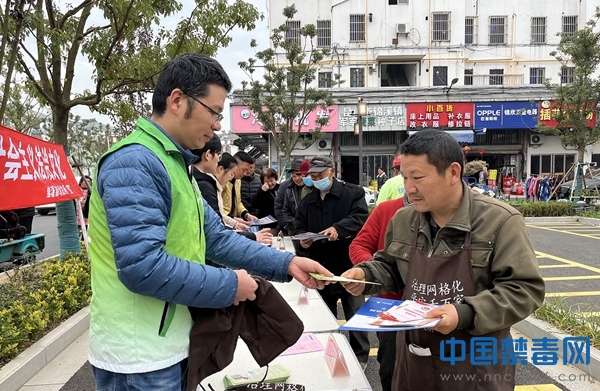 图为工作人员向群众发放禁毒宣传册。中国禁毒网发