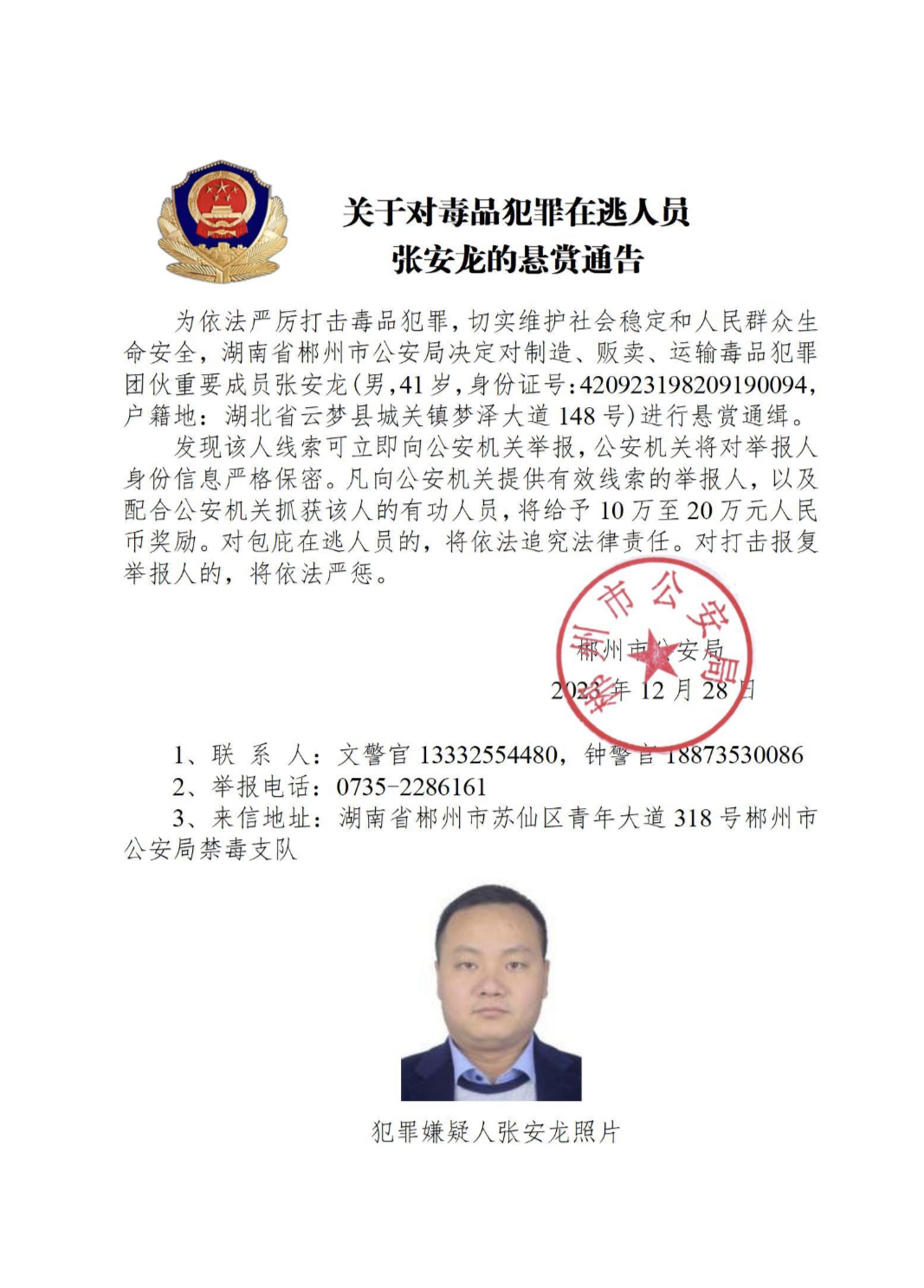 近年来,按照国家禁毒委、公安部“清源断流”行动战略部署,各地公安机关通过开展国际执法合作,对潜藏在境外向我境内大肆走私贩卖毒品逃犯开展追捕行动,累计抓获涉毒逃犯300余名,对境外贩毒团伙形成了有力震慑。为进一步依法严厉打击缅北地区毒品犯罪,全力遏制境外毒品向我渗透内流,切实维护人民群众生命健康和财产安全,各地公安机关在充分掌握相关犯罪事实和证据的基础上,决定对张安龙、曾小勇等10名藏匿在缅北地区涉毒逃犯进行公开悬赏通缉,力争早日缉拿归案,坚决铲除长期危害我社会稳定的境外“毒瘤”。其中,湖南省郴州市公安局决定对张安龙、马文祥、吴玉杨进行公开悬赏通缉;湖南省株洲市公安局决定对杨金梅进行公开悬赏通缉;江西省新干县公安局决定对曾小勇、李国平、孙强进行公开悬赏通缉;浙江省温州市公安局决定对颜欢平进行公开悬赏通缉;四川省遂宁市公安局决定对母朝东进行公开悬赏通缉;贵州省黔东南州公安局决定对龙华进行公开悬赏通缉。
