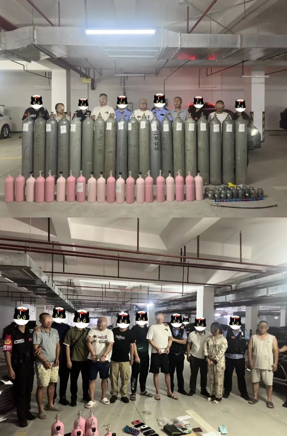 经过4个多月的跟踪侦查和调查取证,专案组获得重要线索——该团伙上线正在组织一批“笑气”运往三亚贩卖。7月26日,专案组实施统一收网,在三亚某小区抓获金某等5名犯罪嫌疑人,以及吸食“笑气”人员孙某等20人,并在某小区仓库内查获一处储存“笑气”的窝点,缴获“笑气”53瓶,约1000升,净重353.94公斤。