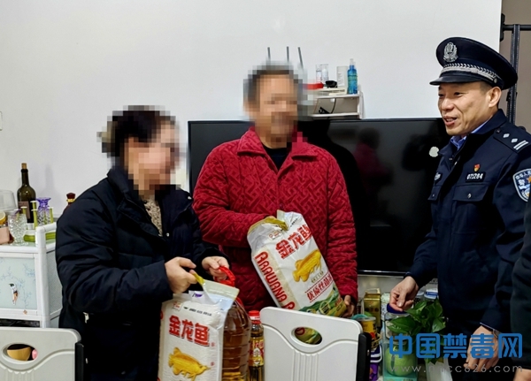 图为民警向戒毒康复人员家庭送上慰问物资。中国禁毒网发