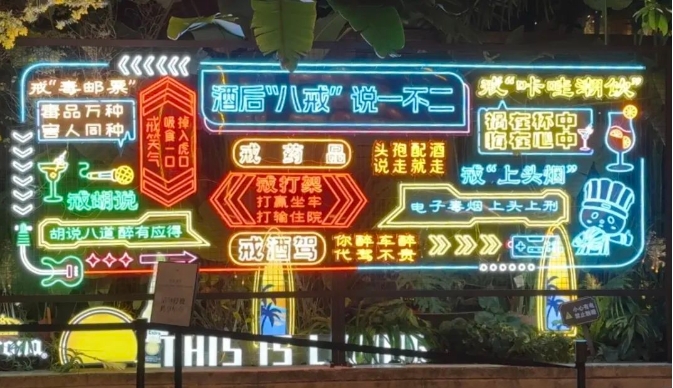 “这个酒后‘八戒’写得好有意思啊!”站在不二酒吧门口,不少市民顿足观看评论。“我们希望结合酒吧背景,无感植入禁毒宣教,正能量开展禁毒宣传,倡导健康绿色夜生活。”