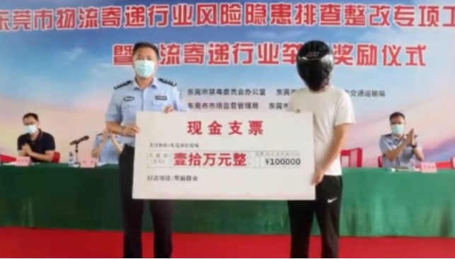2022年11月,东莞市虎门镇一名物流企业员工在对邮寄的四箱衣物进行开箱查验时,发现衣服内夹带了疑似毒品的物品,于是立即报警举报。警方循线追查,侦破一起特大跨境走私毒品案,成功斩断了一条毒品走私贩运通道。根据相关法律规定,东莞市公安局对该员工给予表彰,并颁发奖金10万元。