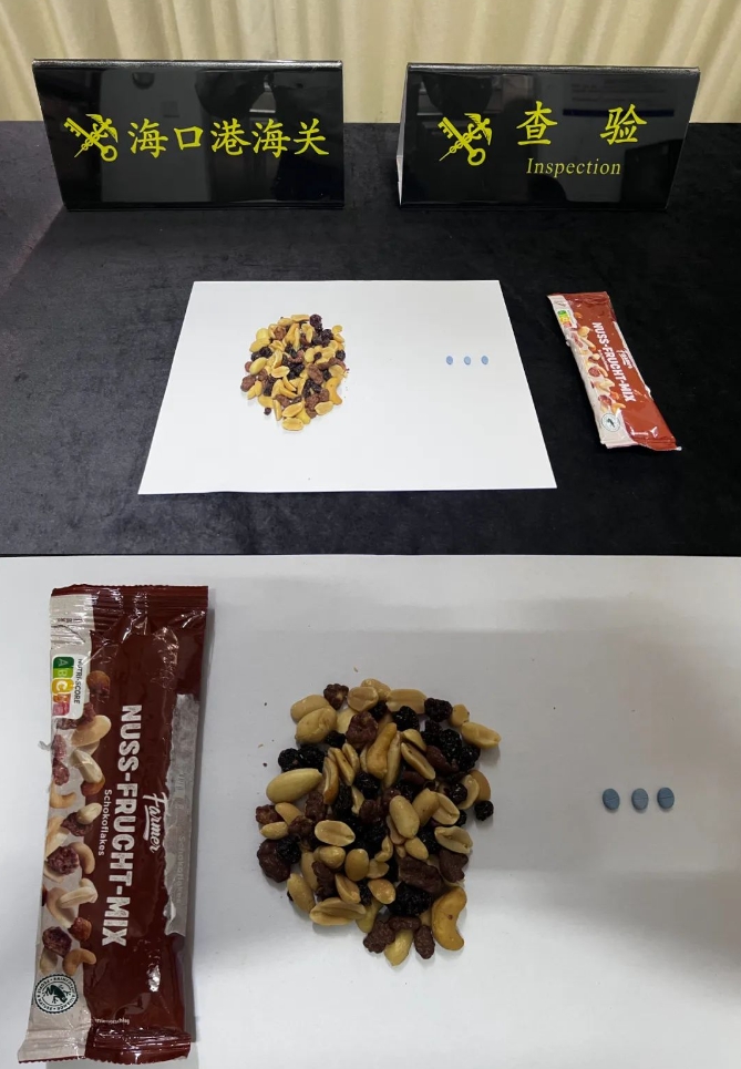 近日,海口海关所属海口港海关邮检现场在对申报进境邮件进行检查时,发现1票寄自境外的进境邮件存在较高风险。经开箱彻查,发现邮件内包含袋装坚果混合巧克力两包,其中一包中夹藏国家列管一类精神药品“三唑仑”3粒。