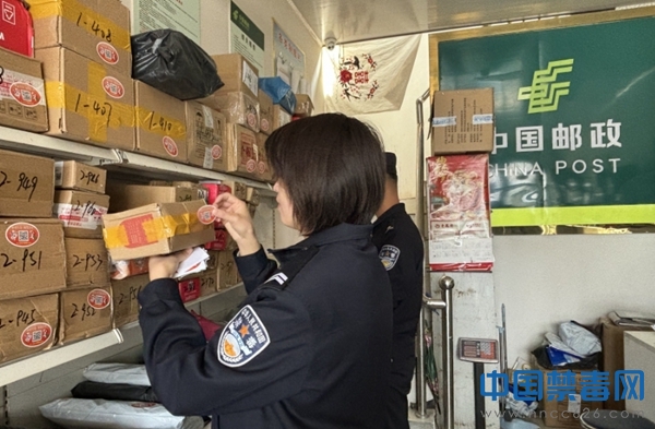 图为禁毒专干给快递贴上禁毒知识小贴纸。中国禁毒网发