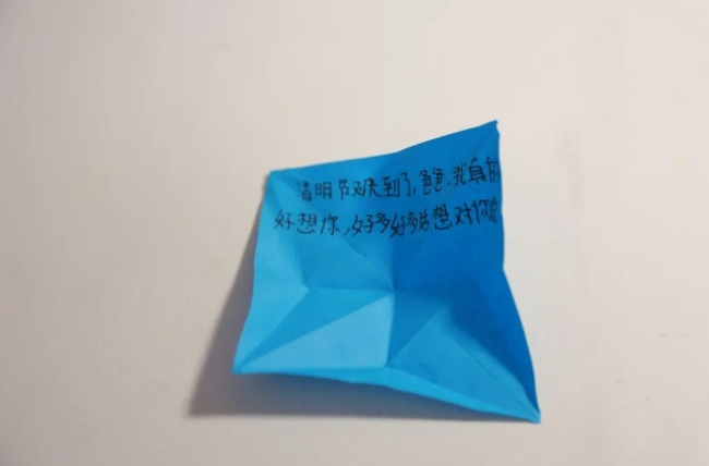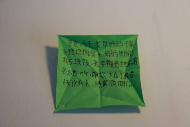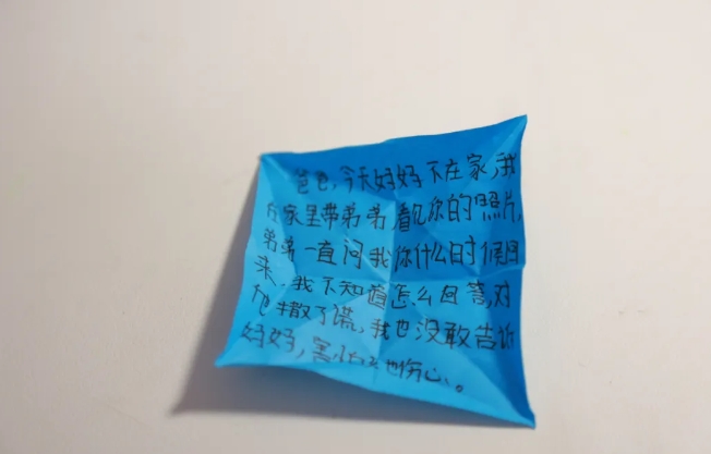 女儿在叠千纸鹤的折纸上写下“爸爸,今天妈妈不在家,我在家里带弟弟,看见你的照片弟弟一直问我你什么时候回来,我不知道怎么回答,对他撒了谎,我也没敢告诉妈妈,害怕她伤心。”