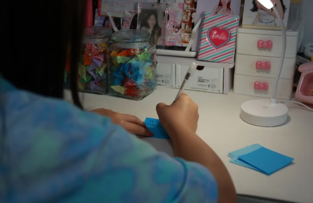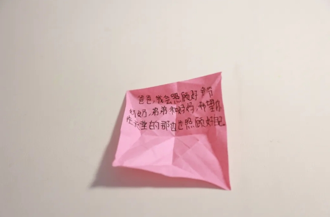女儿在叠千纸鹤的折纸上写下“爸爸,我会照顾好爷爷奶奶,弟弟和妈妈,希望你在天堂的那边也照顾好自己。”