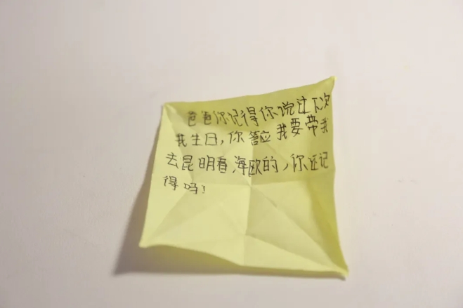 女儿在叠千纸鹤的折纸上写下“爸爸,你记得你说过下次我生日,你答应我要带我去昆明看海鸥的,你还记得吗?”