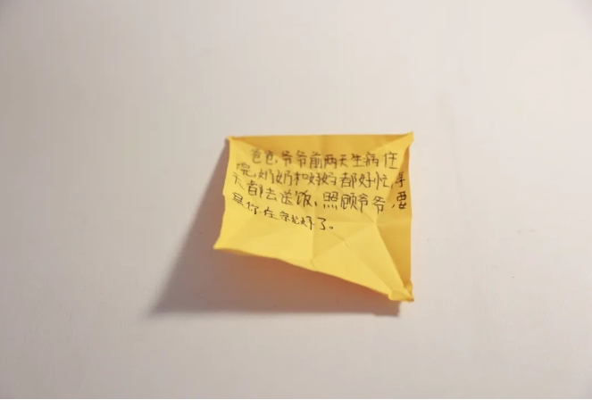 女儿在叠千纸鹤的折纸上写下“爸爸,爷爷前两天生病住院,奶奶和妈妈都好忙,每天都去送饭,照顾爷爷,要是你在就好了。”
