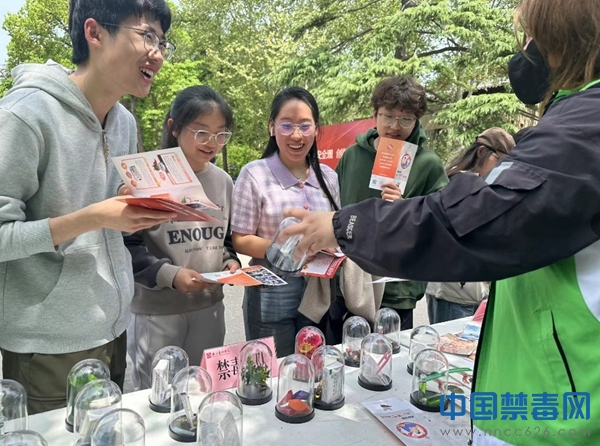 禁毒民警和禁毒社工及志愿者通过拉横幅、摆展台展板等方式,为禁毒宣传“暖场”。活动中,禁毒民警结合工作中办理的相关案件,向学生讲解含依托咪酯“上等电子烟”等新型毒品危害。同时通过展示仿真毒品模型、发放禁毒宣传手册等形式,向学生讲解禁毒相关知识,提高他们识毒、防毒、拒毒能力。