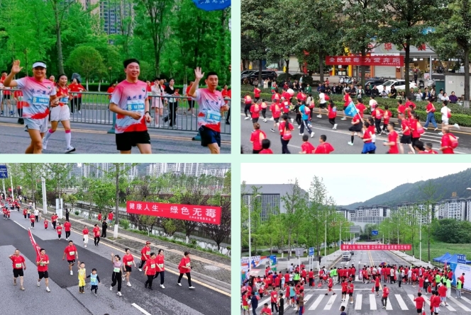 赛道沿线两侧等区域悬挂着禁毒标语横幅,营造出“全民健身,全民禁毒”的浓厚氛围。