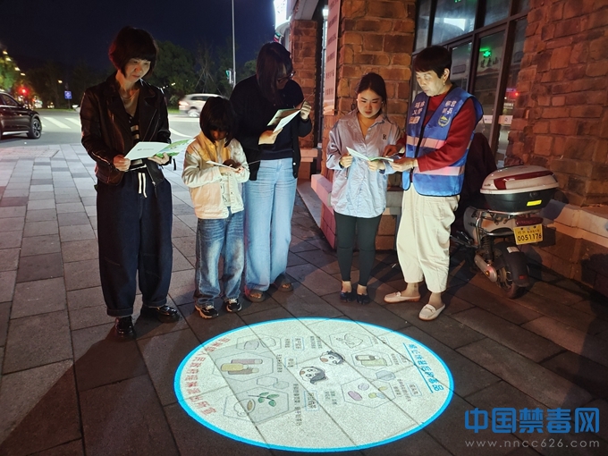 夜幕降临之时,出来散步的居民发现印有“罂粟不是菜,一株也犯法”、“精心伪装后的毒品”等带有禁毒元素的光影,在人员流动密集处、居民必经出入口的路面上“闪耀”。投影射灯配有新型毒品、毒品原植物罂粟的详细介绍及图片,以震撼的视觉冲击,在照亮路面的同时,用无声的语言向过路群众宣传禁毒知识,给居民带来耳目一新的禁毒宣传体验。大家纷纷表示,这种看得见的禁毒宣传,接地气又有创意,为行人照亮路的同时,提升了民众的禁毒意识,非常有意义。