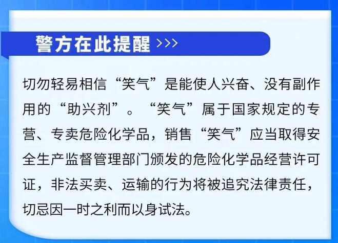 截至4月20日,办案民警成功将本案11名非法经营贩卖“笑气”的涉案人员全部抓获,该犯罪团伙被连根拔起。经初步讯问,该团伙对参与贩卖、运输、吸食“笑气”的行为供认不讳。截至目前,该案已刑拘11人,行政处罚17人。案件正在进一步侦办中。