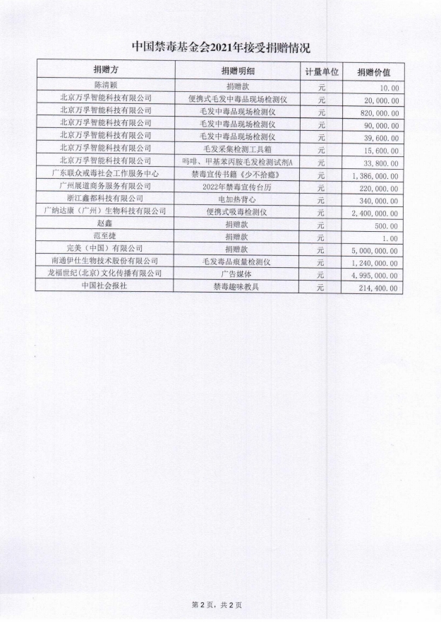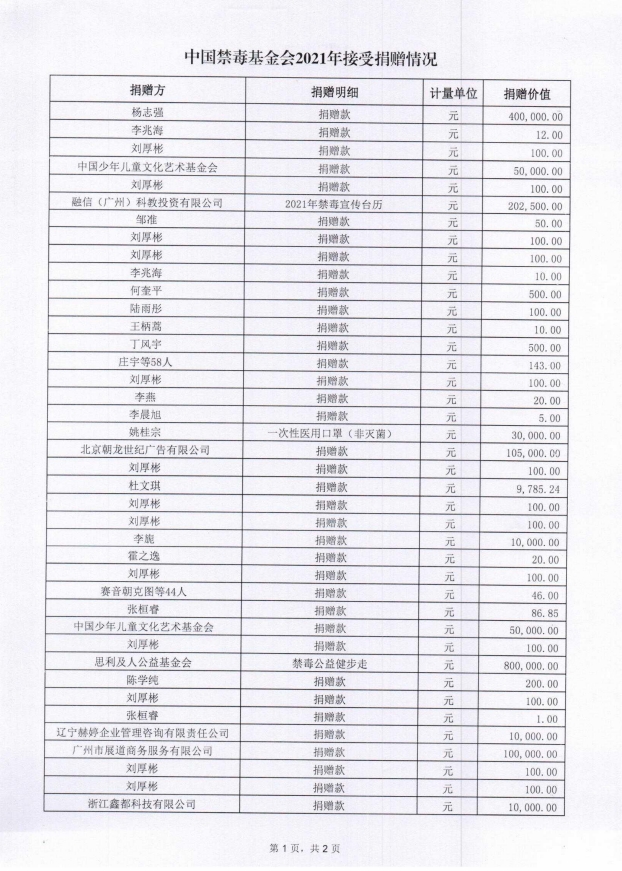 中国禁毒基金会2021年接受捐赠情况-中国禁毒网