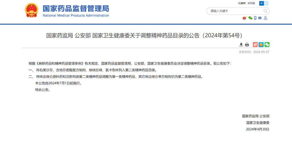 自2024年7月1日起,国家药品监督管理局、公安部、国家卫生健康委员会决定调整精神药品目录:将右美沙芬、含地芬诺酯复方制剂、纳呋拉啡、氯卡色林列入第二类精神药品目录。将咪达唑仑原料药和注射剂由第二类精神药品调整为第一类精神药品,其它咪达唑仑单方制剂仍为第二类精神药品。