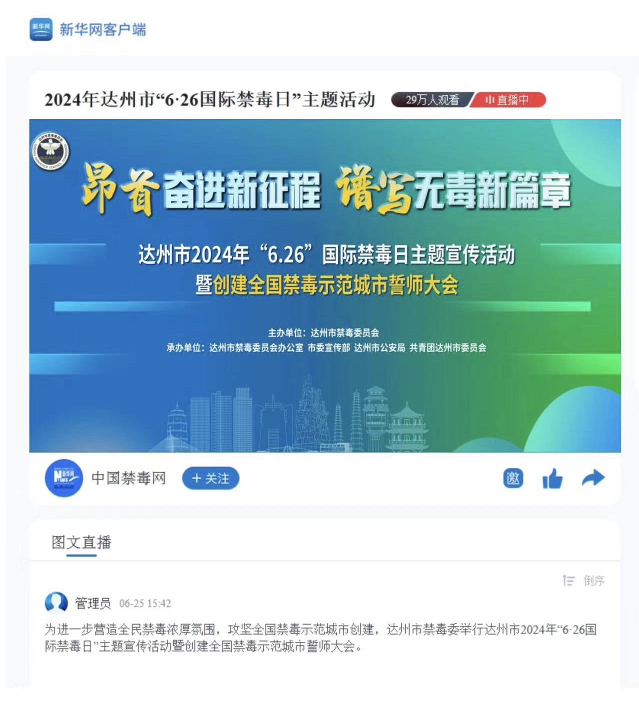 中国禁毒网讯 为进一步营造全民禁毒浓厚氛围,攻坚全国禁毒示范城市创建,达州市禁毒委举行2024年“6.26”国际禁毒日主题宣传活动暨创建全国禁毒示范城市誓师大会。