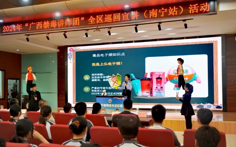 广西历来高度重视禁毒宣传教育工作,始终将禁毒宣传教育当作禁毒工作治本之策,坚持解放思想、守正创新,深入发动群众参与禁毒斗争。今年以来,全区禁毒部门将“广西禁毒讲师团”的组建和宣讲活动作为年度重点工作持续推进,禁毒委各成员单位、各地各部门紧密协作配合,经过推荐、选拔和培训,于5月完成全区三级“禁毒讲师团”队伍组建,来自政法、教育部门、企事业单位、社工组织等各行各业的800多人受聘为“禁毒讲师”;6月21日,广西壮族自治区禁毒委领导在2024年“6·26”国际禁毒日集中宣传活动暨“清朗校园”专项行动启动仪式上为“禁毒讲师团”代表进行授旗;9月,“广西禁毒讲师团”在全区开展培训和宣讲比赛,评选出6名金牌讲师、8名优秀讲师和一批先进个人、团体。
