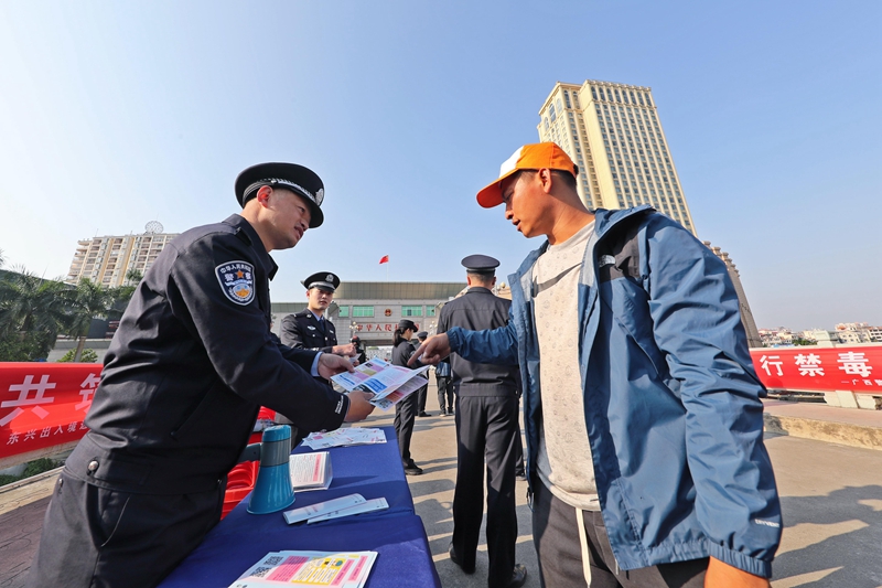 为提升出入境旅客识毒、防毒、拒毒意识和能力,营造全民禁毒的良好氛围,12月20日,广西出入境边防检查总站东兴出入境边防检查站在中越友谊大桥开展跨国联合禁毒宣传活动。