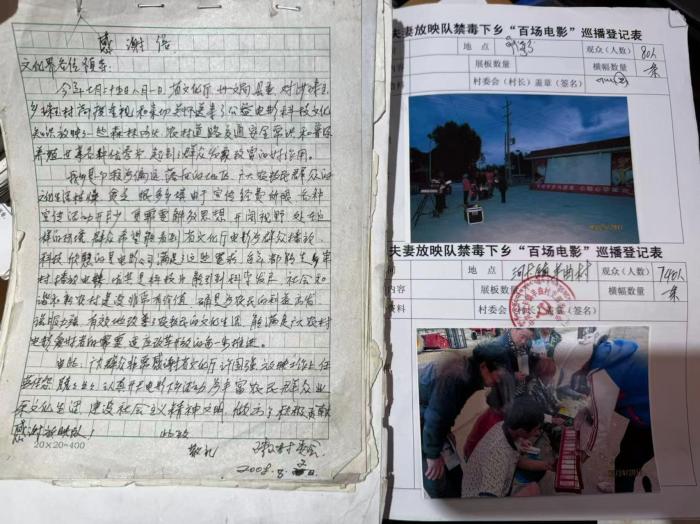 图为感谢信(左)、禁毒电影巡播登记表。祁绣娟 摄