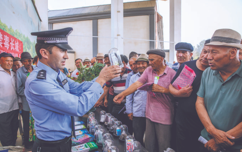 近日,新疆维吾尔自治区叶城县公安局开展禁毒宣传活动,向群众普及禁毒知识,推动“健康人生,绿色无毒”的理念深入人心。图为叶城县公安局恰尔巴格派出所民警展示仿真毒品模型,讲解禁毒知识,提高群众的识毒防毒拒毒意识。徐贤华 摄