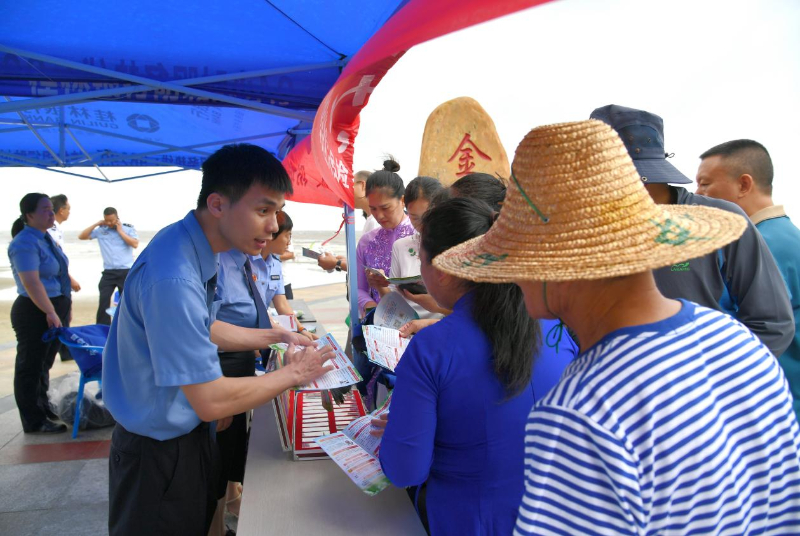 9时许,在万尾金滩的禁毒法治宣传活动吸引了村民、游客聆听与咨询。检察干警和公安民警向他们普法,介绍毒品种类与识毒方法,讲解吸食毒品的症状与危害,析清毒品犯罪对自身、家庭和社会的严重危害。同时,发放印有禁毒标语的渔帽、围裙等实用物品,方便他们随时看到警示。