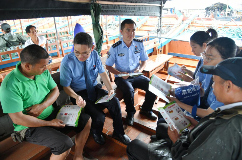 6月18日,检察干警和公安民警在五涵码头向渔民分发禁毒手册,普及拒毒防毒知识。通讯员 付海茵 摄