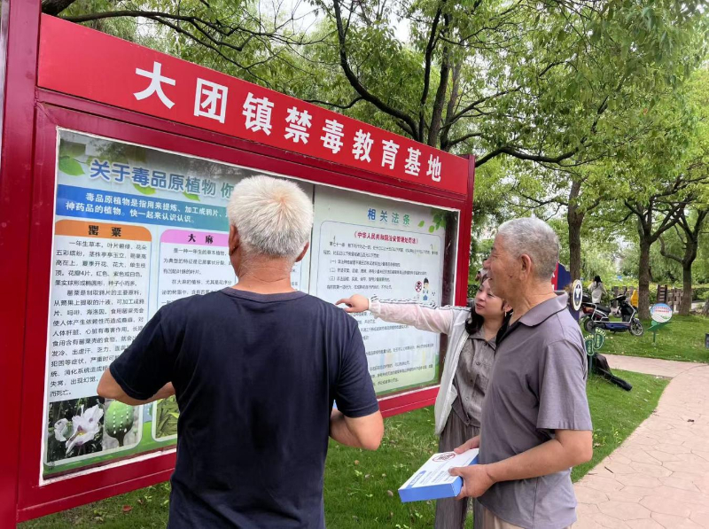 在金团公园,大团镇平安办利用禁毒教育基地设立宣传点,向居民发放禁毒手册,讲解新型毒品的伪装形式,提醒大家提高警惕。同时,充分利用户外电子屏滚动播放禁毒公益短片,让禁毒知识随处可见、深入人心。