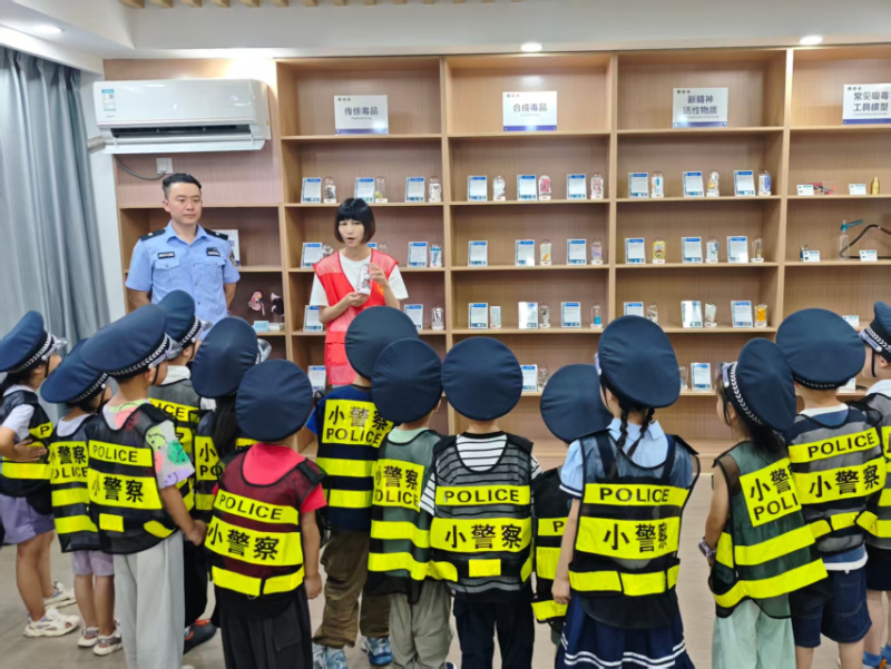 展示区,禁毒社工通过仿真毒品模型,生动地向“小警察”们介绍了常见毒品的种类、特征及危害。孩子们好奇地围在毒品仿真模型前,认真听着奶粉、跳跳糖等伪装毒品要如何防范的。互动问答环节,“小警察”们踊跃举手,积极回答禁毒知识问题。
