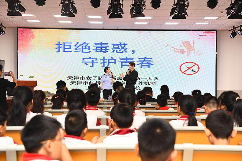 9月4日,天津各中小学迎来开学日,上海道小学办学集团天津市红桥学校的报告厅气氛热烈,一场以禁毒为主题的“开学第一课”正式开讲。活动由天津市女子强制隔离戒毒所、天津市红桥区禁毒专项工作机制、上海道小学办学集团天津市红桥学校联合主办。