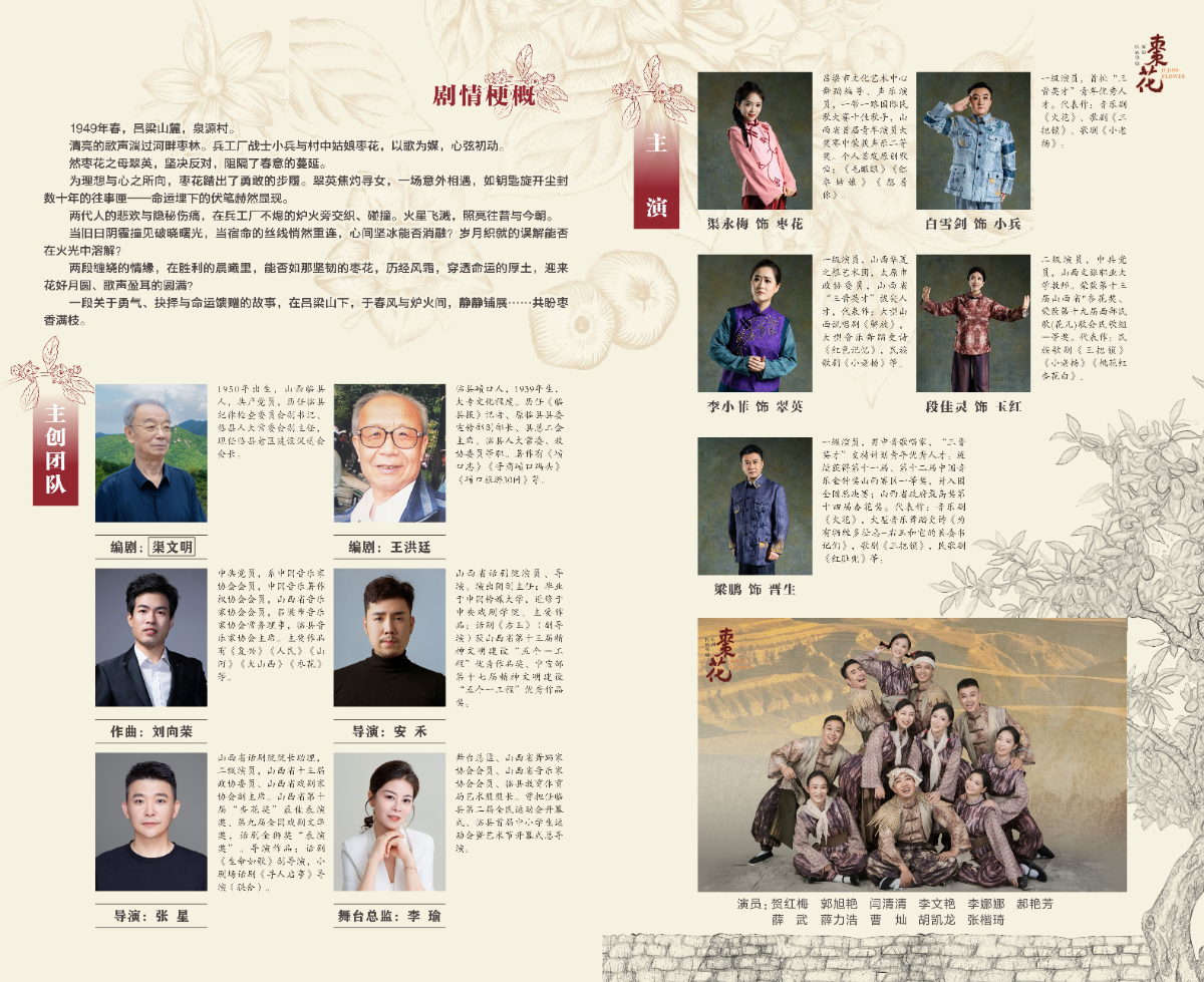 作品以1949年春天的山西吕梁革命老区为背景,融合山西临县民歌元素与现代歌剧表现形式,通过青年战士与农村姑娘的爱情主线,串联起两代人的家国情怀与命运重逢。全剧以“枣花”为意象,象征坚韧与新生,音乐创作大量运用晋西北民歌调式,并结合戏剧性合唱与对唱,展现战争年代军民鱼水情与个体命运的跌宕起伏。剧中误会、巧合等传统戏剧手法的运用,使革命叙事兼具民间趣味,最终在“军民同庆”的双婚礼中升华主题,传递对和平的珍视与革命精神的传承。