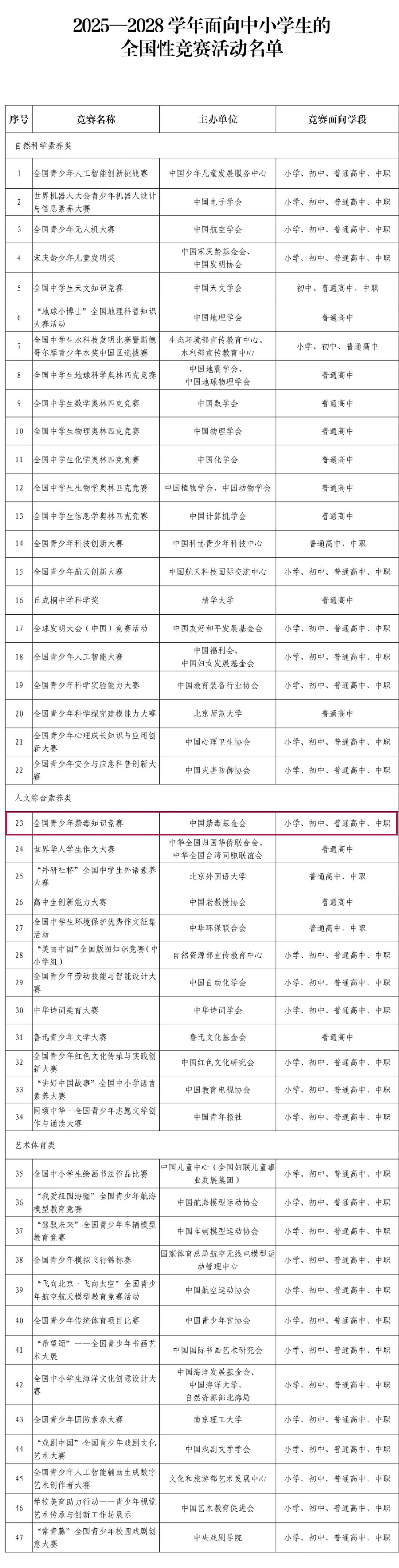 本次公示的名单中,自然科学素养类竞赛活动包括全国青少年人工智能创新挑战赛、世界机器人大会青少年机器人设计与信息素养大赛、全国青少年无人机大赛、宋庆龄少年儿童发明奖等22项;人文综合素养类竞赛活动包括全国青少年禁毒知识竞赛、世界华人学生作文大赛、“外研社杯”全国中学生外语素养大赛、高中生创新能力大赛等12项;艺术体育类包括全国中小学生绘画书法作品比赛、“我爱祖国海疆”全国青少年航海模型教育竞赛、“驾驭未来”全国青少年车辆模型教育竞赛、“飞向北京·飞向太空”全国青少年航空航天模型教育竞赛活动等13项。
