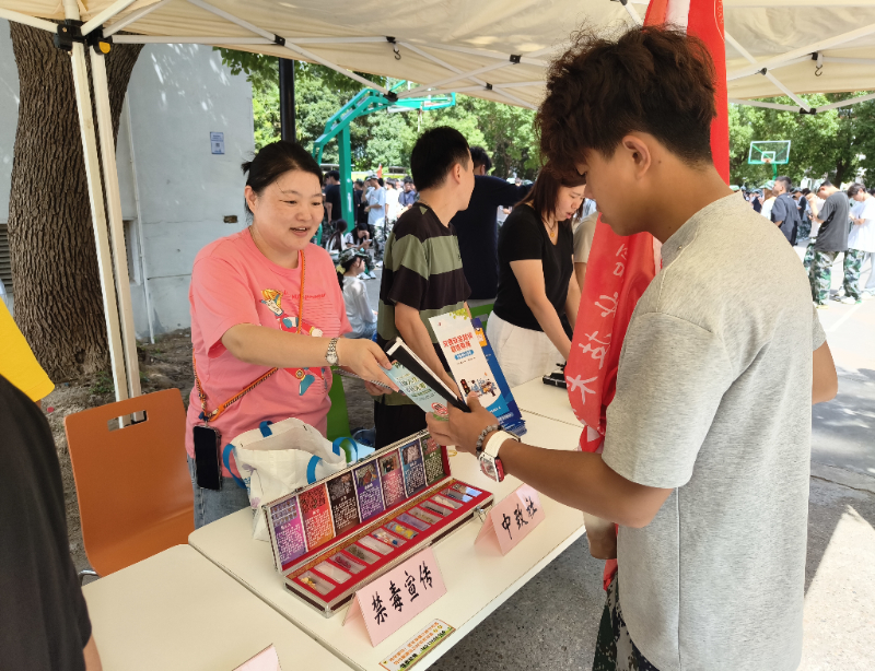 活动当天,校园广场的禁毒宣传摊位热闹非凡。色彩鲜明的禁毒海报、形态逼真的新型毒品仿真样品整齐陈列,志愿者们手持宣传册,向过往学生细致讲解“邮票”“跳跳糖”等伪装毒品的辨别方法,提醒大家警惕“朋友分享”“免费试用”等涉毒陷阱。现场设置的禁毒知识转盘人气高涨,学生们在互动中学习禁毒知识,气氛活跃。