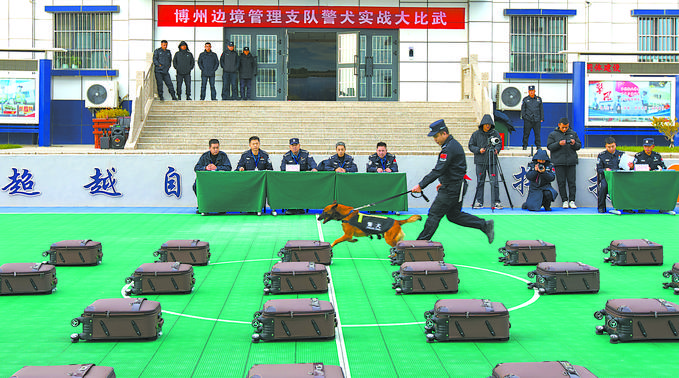 10月17日至18日,新疆出入境边防检查总站博州边境管理支队组织开展警犬实战比武活动,来自各基层所队的15名训导员携警犬围绕实战科目展开激烈比拼。图为训导员携警犬参加毒品搜查科目评比。芦胜磊 摄
