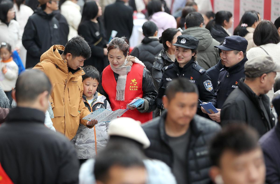 2月27日,在湖北省荆门市东宝区“春风行动”招聘会现场,荆门市公安局东宝区分局民警联合龙泉街道禁毒志愿者,带着禁毒宣传手册、仿真毒品模型,向求职者开展禁毒普法宣传。