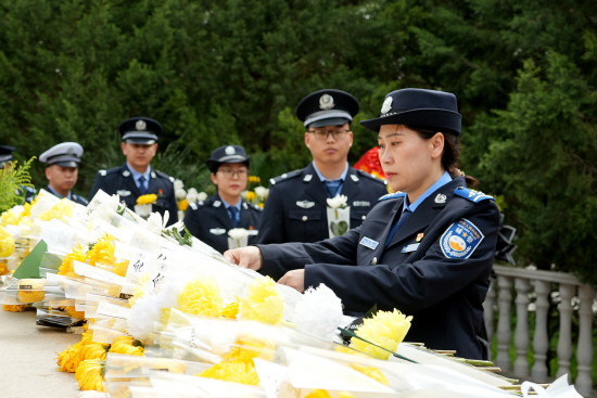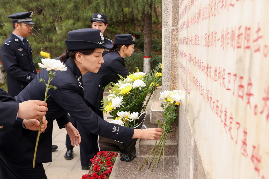 4月2日,河北省石家庄市公安局在石家庄人民警察博物馆英烈厅举行祭奠公安英烈活动。图为民警依次行至英烈墙前瞻仰献花。记者 李雯 通讯员 蔡森 摄