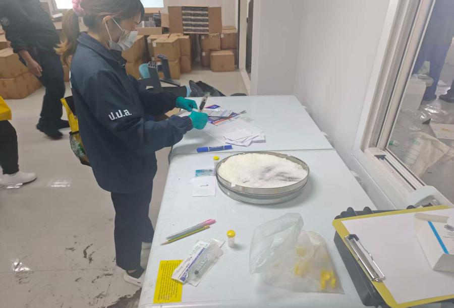 2024年5月,山东省禁毒部门工作中发现,多名制毒嫌疑人购买制毒原料并活跃于中国、泰国、越南等地,涉嫌非法制造依托咪酯。为严厉打击该跨国制毒团伙,公安部禁毒局指导山东省禁毒部门全力开展案件侦办工作,并与泰国、越南禁毒部门开展执法合作。根据中方提供的情报线索,泰国、越南两国禁毒部门迅速锁定嫌疑人行踪和制毒窝点后,公安部禁毒局即率中方专案组赴泰国开展工作。4月2日,三国执法人员经综合研判和协商,同步开展收网行动,山东、河南、湖南、广东、甘肃等省公安机关组织警力,协同作战,成功破获该案。