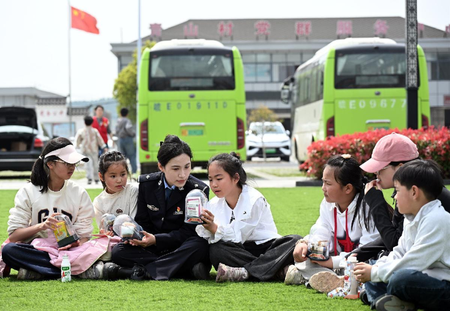 4月2日,安徽省当涂县公安局民警以学生研学活动为契机,深入现场开展禁毒普法宣传。通讯员 卫学超 摄