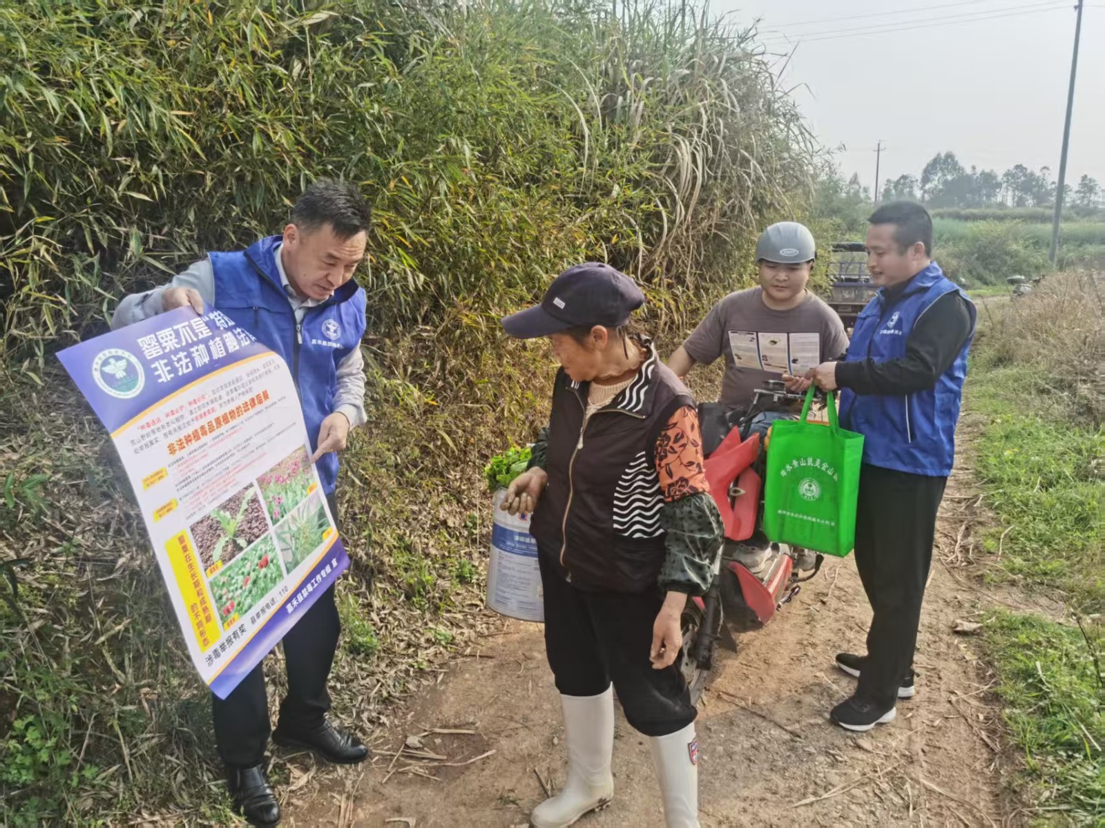 在田间地头,工作人员身着蓝色志愿马甲,穿梭在田埂与农户家中,面对面为村民讲解禁毒知识。他们手持图文并茂的宣传海报,用通俗易懂的语言向群众讲解罂粟、大麻等毒品原植物的识别方法、生长特征及非法种植的法律后果,重点强调“罂粟不是‘特效药’,非法种植触法律”,引导群众自觉抵制非法种植行为,主动参与到禁种铲毒行动中来。同时,工作人员深入田间开展实地排查,仔细查看是否存在非法种植罂粟等毒品原植物的情况,做到早发现、早制止、早铲除。